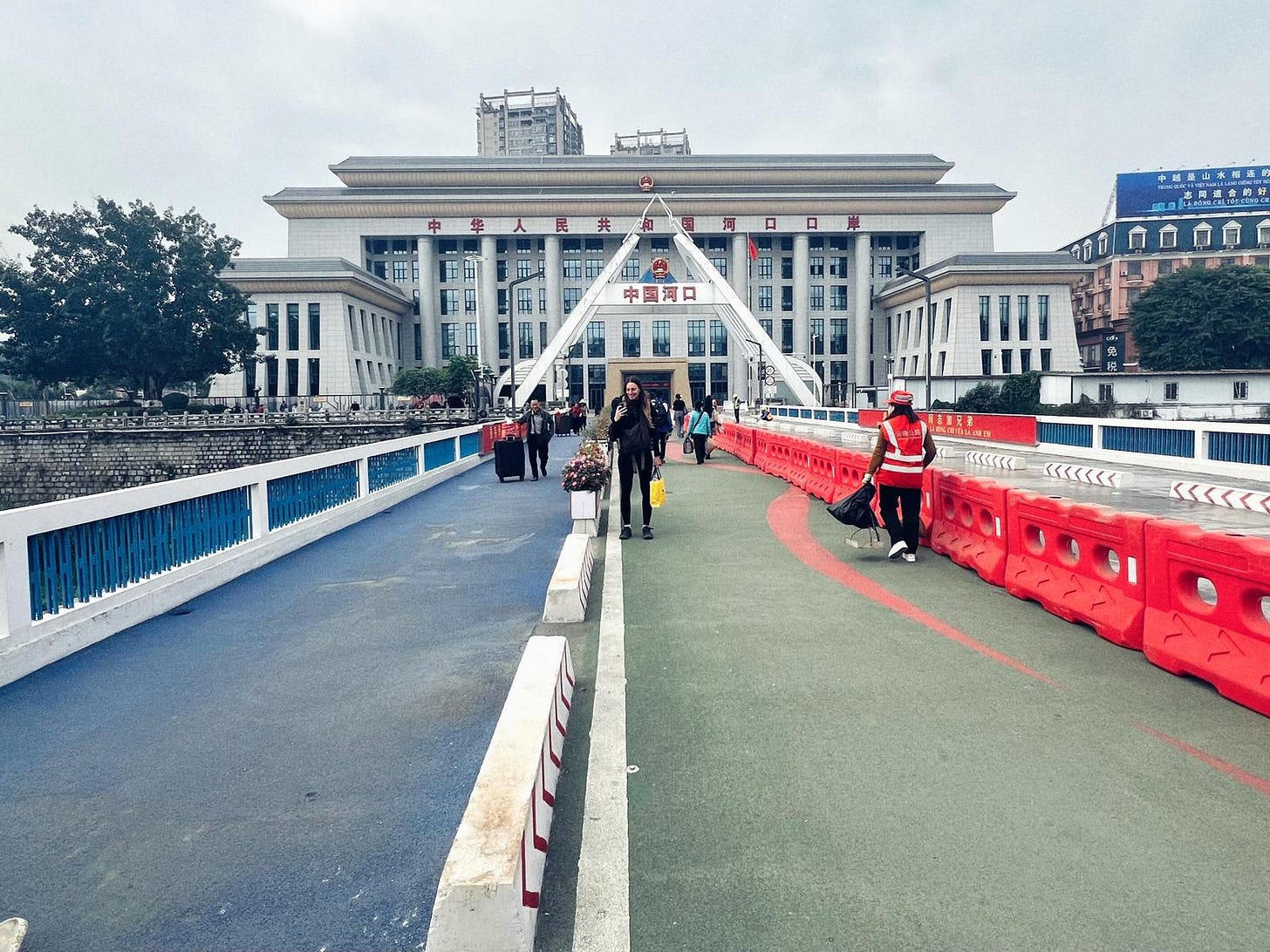 Un giorno attraversiamo un confine a piedi. Il confine è un ponte sul fiume Rosso che da un lato è Cina e dall’altro è Vietnam. Transitano donne con le valige pesanti della merce che venderanno in qualche mercatino di Hanoi; lungo le scale se le caricano sulla schiena come muli e scendono, fino alla frontiera, dove un uomo stanco timbra il passaporto. Timbra anche il mio. Che è forte e mi fa passare i confini senza tante domande.